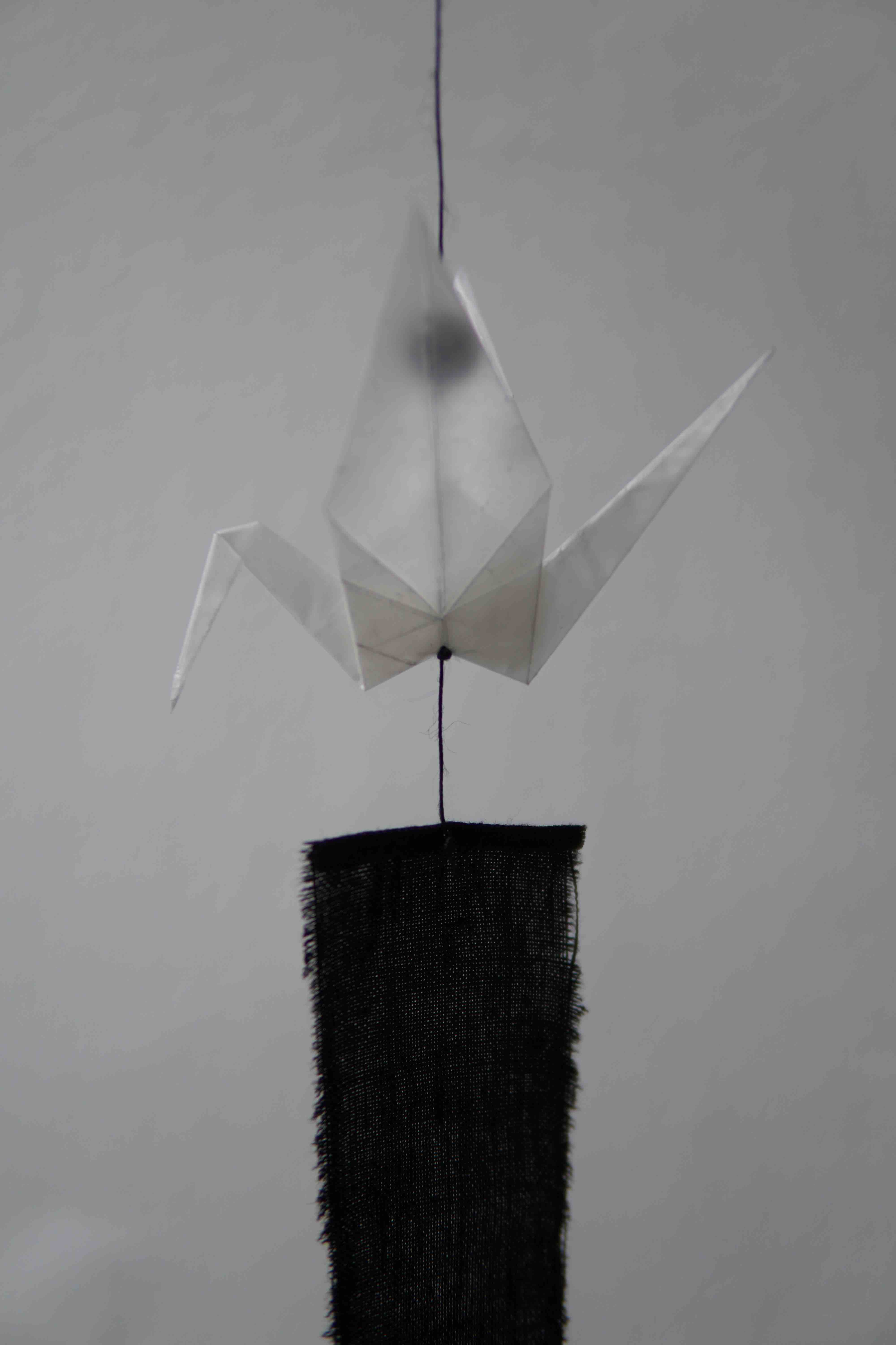 손끝으로 접은 학은 검은 실과 구슬, 그리고 천 조각과 함께 연결되어 천천히 흔들립니다.